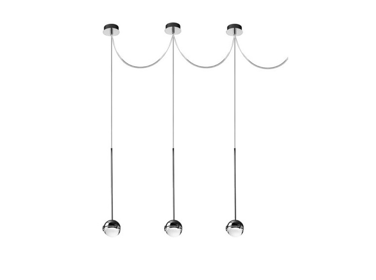 Lamp designed to be suspended above a dining table. It comprises a small sphere (11 cm diameter), half lens and half metal with a chromed or satined nickel finish, designed to provide uniform, lively light for a large dining table or a small bar table, without blinding any of the diners with glare.