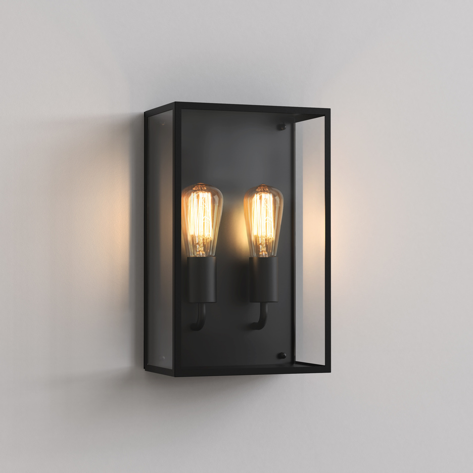 Astro Messina Twin outdoor wall light enriches the outdoor area in an elegant way with trendy vintage style and effective light. The Messina Twin outdoor wall light combines grandiose simple elegance and industrial style in contemporary design. In Great Britain, the lamp is manufactured in the house of the creative lighting company Astro in a square housing made of metal of the highest quality with a black surface finish and frames clear glass inserts on the front and on both outer sides, which offers an open view. Double E27 sockets are integrated next to each other inside, which means that lamps of your choice with a maximum output of 24 watts can be used. The Messina Twin outdoor wall light by Astro impresses best with LED filament lamps, which gives the vintage style, which is currently in trend. When switched on, the lamp creates a wonderfully soft light effect on the side of the wall. Certified with IP44, the Messina Twin outdoor wall light by Astro guarantees reliable protection against splash water and is a good solution for outdoor lighting in entrance areas and house facades.